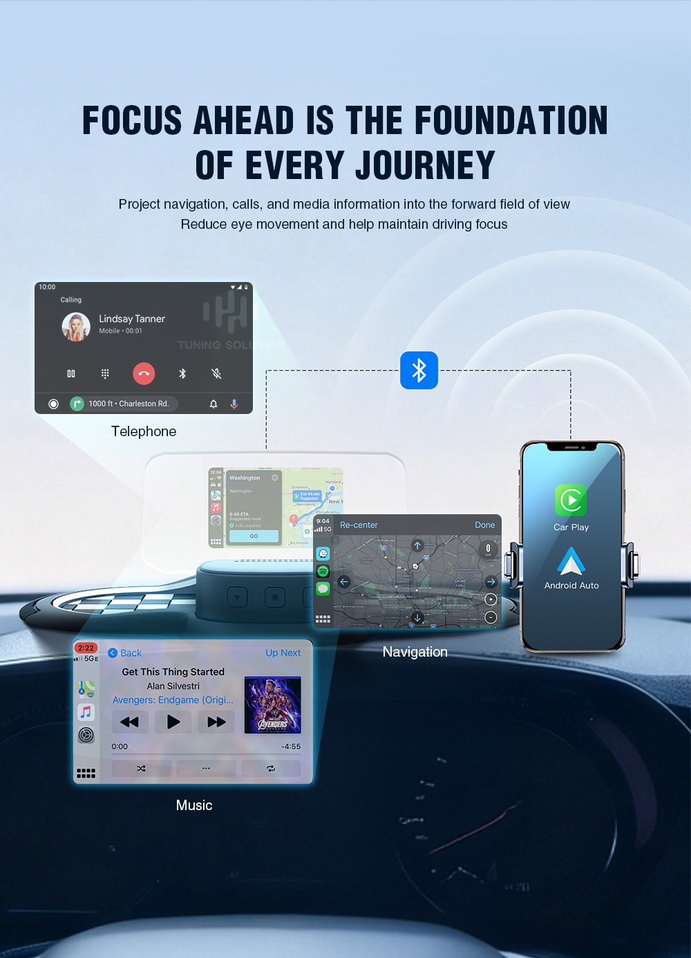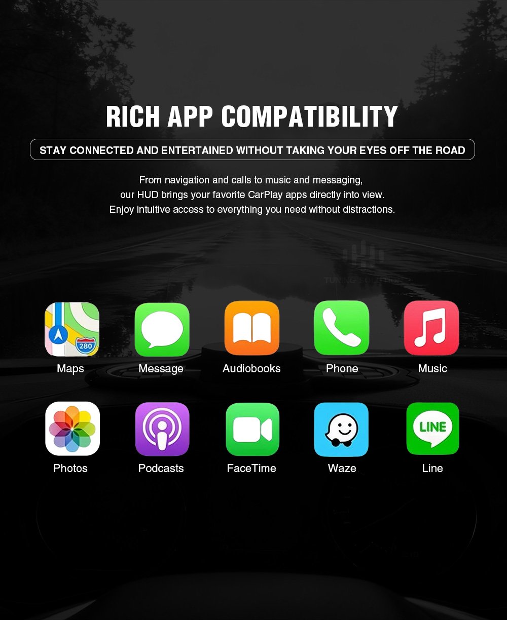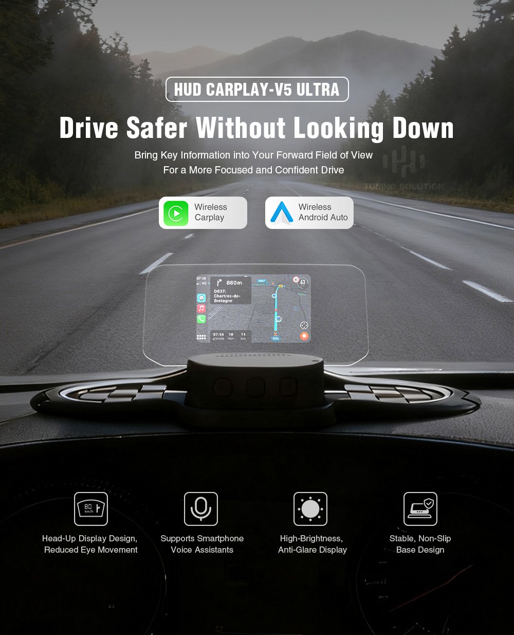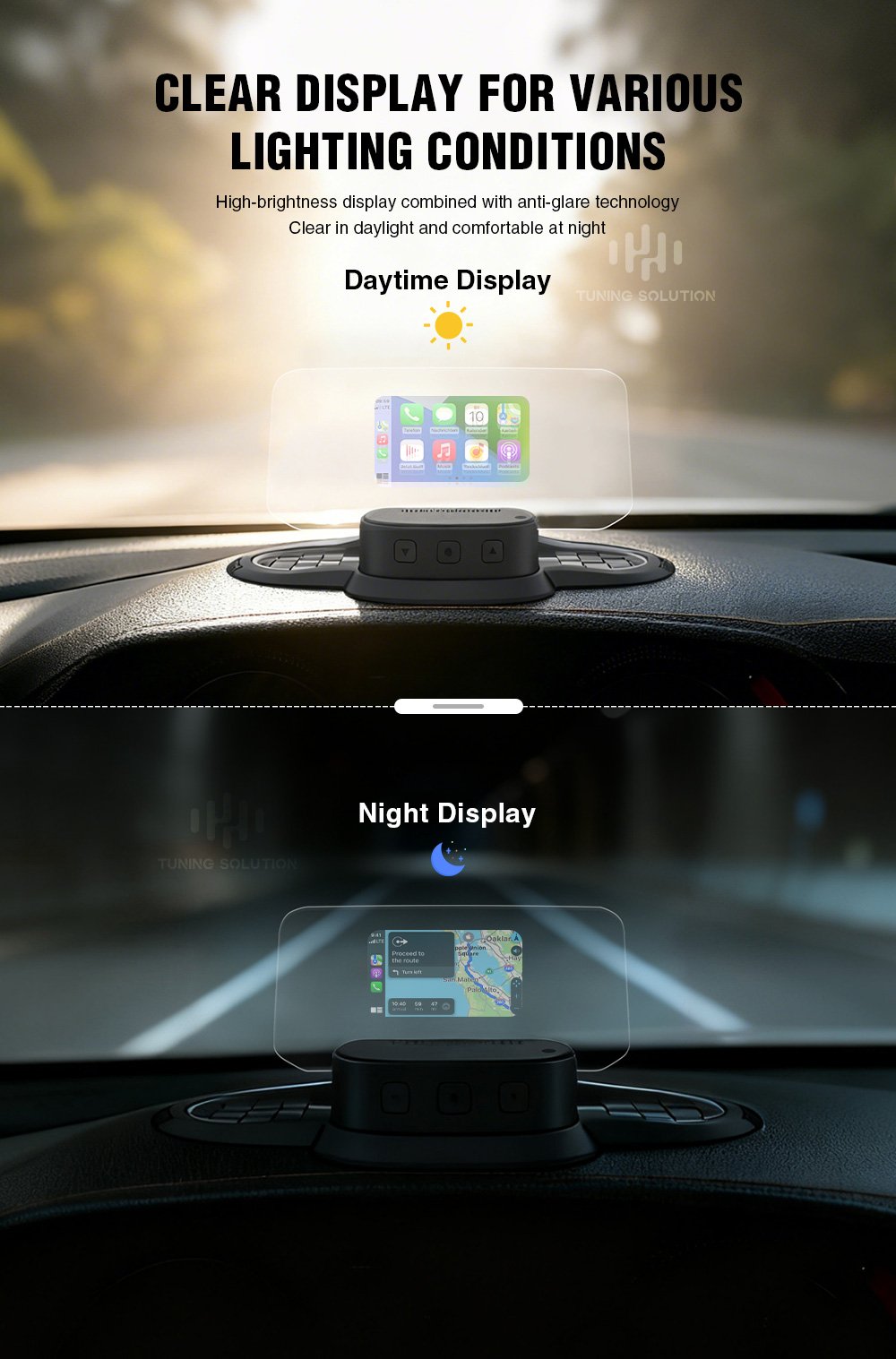 CarPlay-T300 HUD: Head-up display for Apple CarPlay – full compatibility with apps, navigation, calls and music always visible, controlled by voice.
